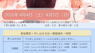 未分類 4月4日(土)・5日(日)MLD レビュークラス開催 ボッダー式MLDセラピストの方々のレベル1とレベル2のブラッシュアップを行うレビュークラスを開催します。資格を取得したばかりの方、時間が経って手技やコツを忘れてしまった方の復習のためのクラスです。二日間出席でボッダーアカデミーインターナショナル本校の修了書が発行されます。 2026.03.08 未分類