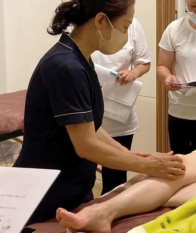 リンパ浮腫を悪化させないためのオイルトリートメントのデモンストレーションに続いて、受講者がペアになって練習をします。上肢、下肢、それぞれのリンパ浮腫ケースについての実技対応ができるようになります。